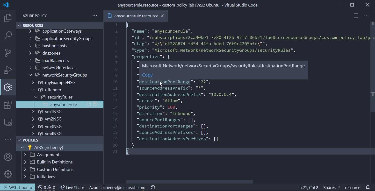 Hover over the destinationPortRanges and sourceAddressPrefixes arrays